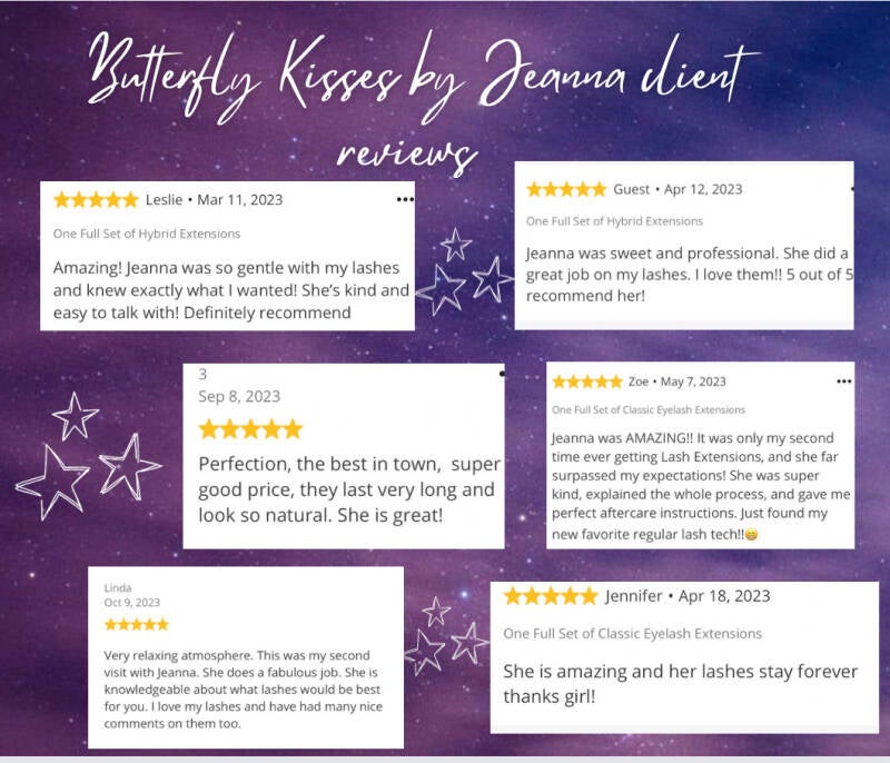 LOVE LOVE LOVE Jeanna!!! I usually go with a classic fill every 3 weeks or so, & after a 3 month break from lashes due to switching jobs and budget cuts, I am so excited to come back and get upgraded to a hybrid set!!! I have been going to her since May of 2023 and there is not a single other lash artist who I would even think about trying. My first visit with her was well explained, & she talked me through every part, which really put my mind at ease as someone who’s had a rough experience in the past with lash extensions. Jeannas prices are literally UNBEATABLE, & her lashes are so high quality! The adhesive that she uses is very gentle, yet strong. That being said, her lashes last FOREVER. She is also the only artist who I’ve ever known who switches to a stronger, more waterproof adhesive for the summertime as well, ensuring that your lashes will always look great and last as long as possible. And to top everything off, she does this in a relaxing environment that she picked out to make sure her clients would always have the best lash-nap room. 10/10 recommend! Can’t wait to be back!🥰
